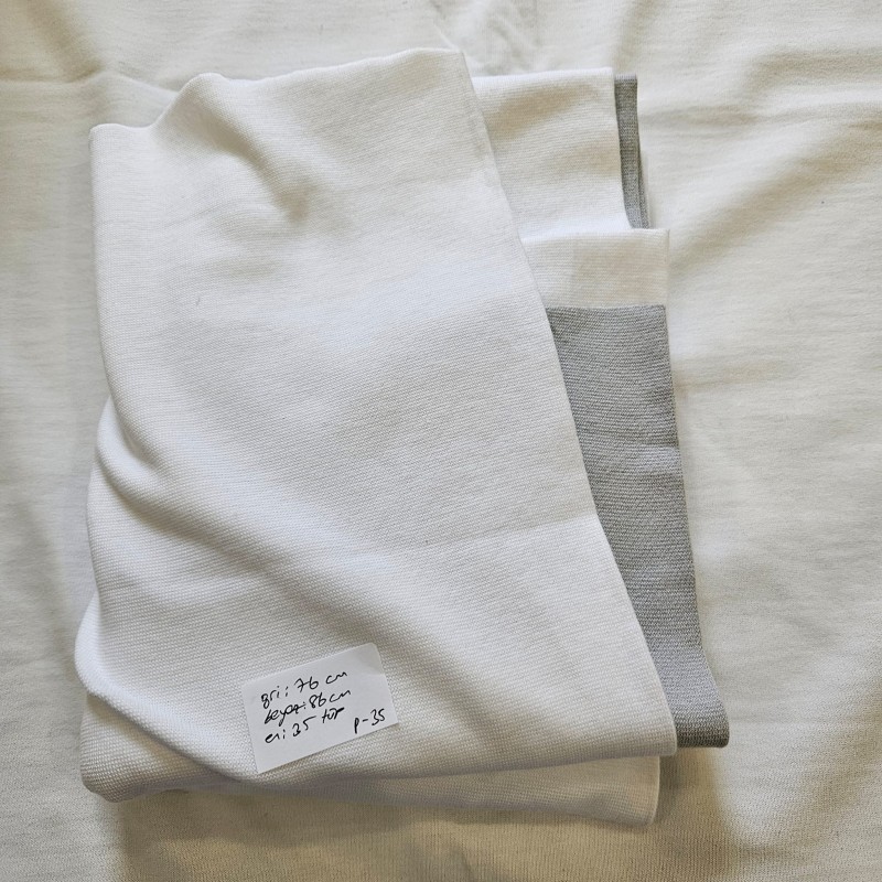| Kumaş Hakkında | 2 parçadan oluşuyor. 1. Parça Beyaz Ribana: 86x35(tüp) cm 2. Parça Beyaz Ribana: 76x35(tüp) cm |